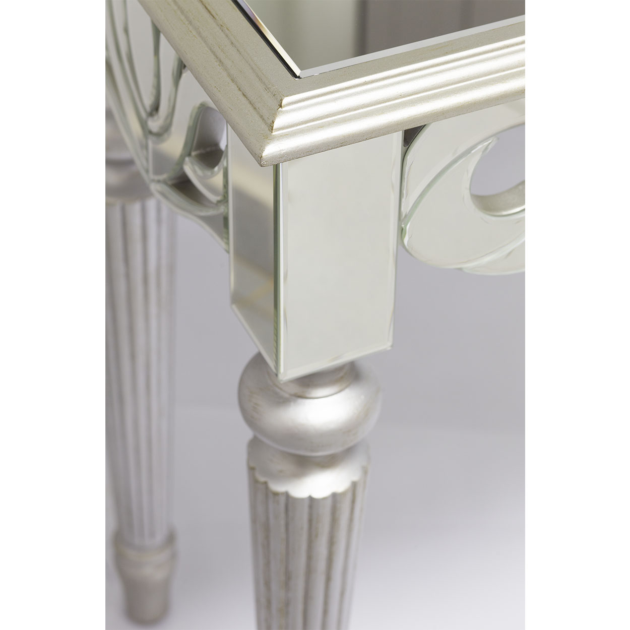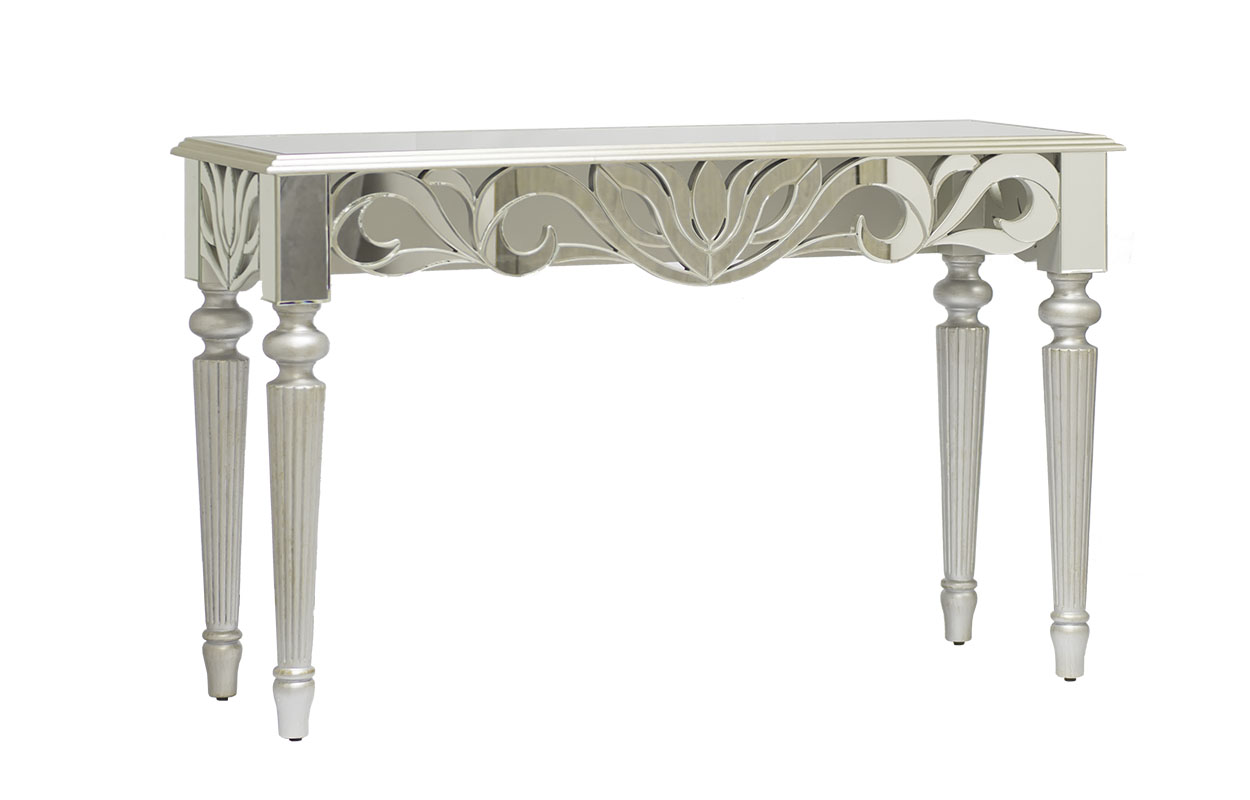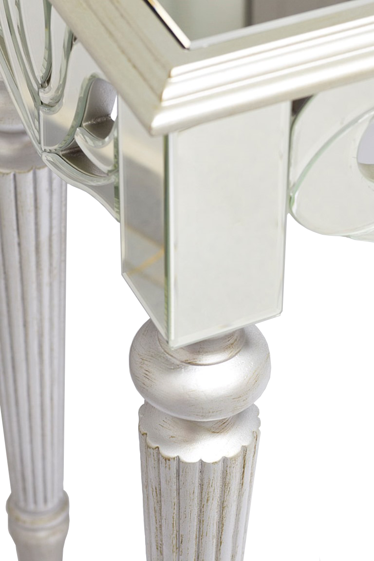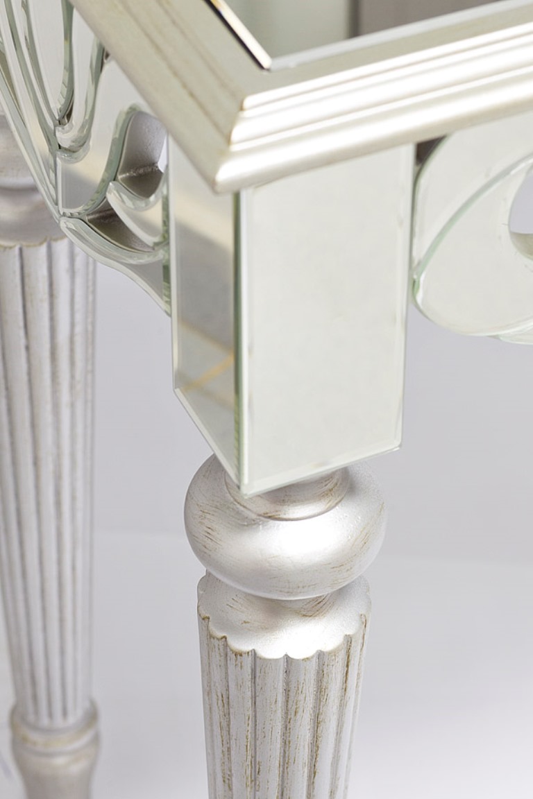 Зеркальная консоль подойдет людям, которые ценят красоту и стиль в сочетании с практичностью. Эта модель на точеных серебристых ножках украшена изящным резным флористическим узором в стиле арт-нуво по краю столешницы. Высококачественное зеркало, тонкая резьба и тщательная окраска каждой детали делают эту дизайнерскую консоль настоящим произведением искусства. На консоли будут прекрасно смотреться фотографии в рамках, вазы с цветами, статуэтки или фарфоровый сервиз. Вы можете использовать ее в качестве роскошного туалетного столика в спальне или подставки под перчатки и дамские сумки в прихожей. Зеркальная мебель выполняет еще одну важную функцию – она помогает визуально расширить пространство. Зеркальные блики создают игру света и тени на окружающих предметах, преображая пространство. Ваш дом станет совершенно особенным, если вы решитесь на покупку этой изысканной консоли!