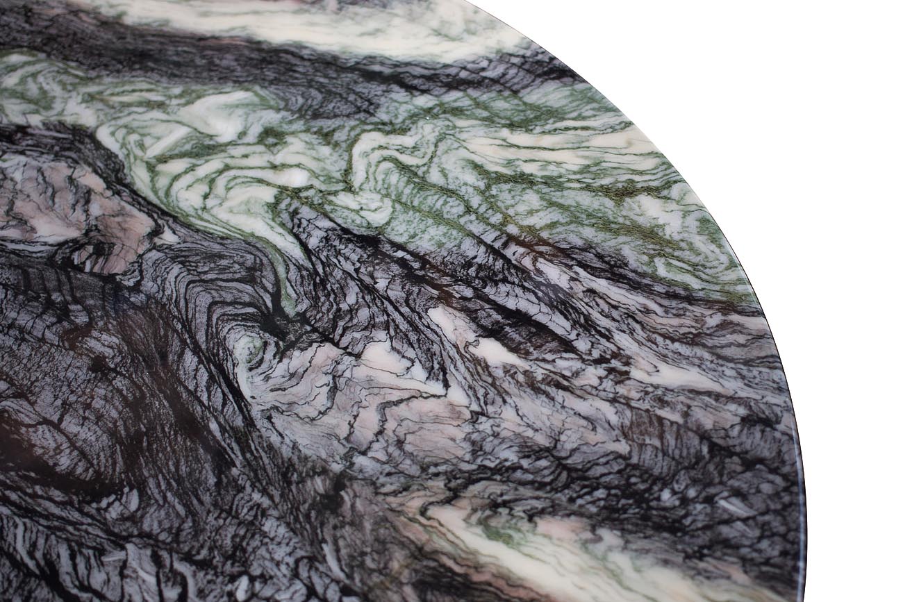 Благодаря необычной форме ножки большой обеденный стол Cippolo выглядит очень изящным. Основание стола выполнено из прочного стеклопластика с полиуретановым покрытием черного цвета. Столешница из искусственного мрамора (на основе искусственного камня) с уникальным рисунком каждого стола сделает вашу столовую или гостиную элегантной и неповторимой.